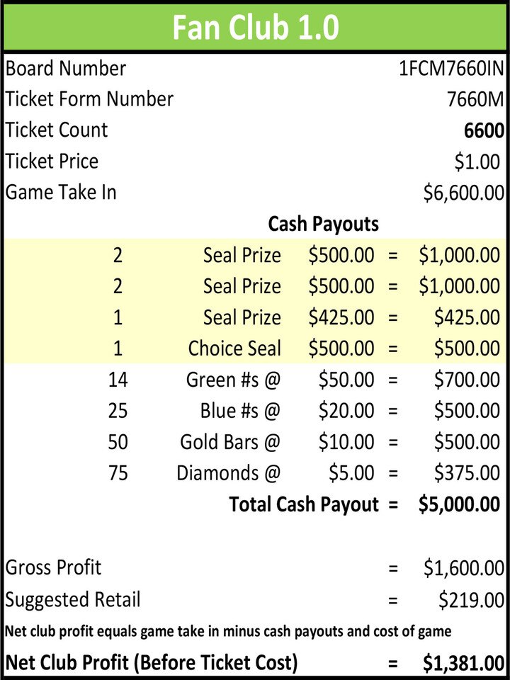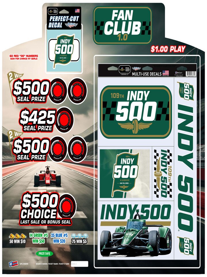 25 INDY 500 1.0 Board 6600 CT (0) No Reviews yet Pinit $219.00 Quantity discounts available QuantityPrice Item name/number: 25 INDY 5001.0 Board $1.00 6600tc UPC: 398403 Denomination: 1.00Ticket Count: 6600Top Prize: $500.00Bottom Prize: $5.00Payout: $5,219.00Profit: $1,381.00# of Pulls: 1Deals per Case: 1 Quantity -+ Add to Cart Reviews 0 BackRatings & ReviewsNo reviews availableBe the first to Write a Review