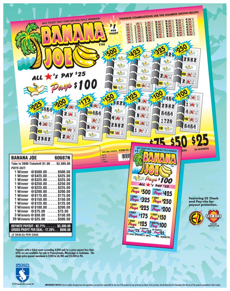 BANANA JOE 3990 CT NLS (0) No Reviews yet Pinit $224.00 Quantity discounts available QuantityPrice Item name/number: AN60687N UPC: 125753 Denomination: 1.00Ticket Count: 3990Top Prize: $500.00Bottom Prize: $25.00Payout: $3,300.00Profit: $690.00# of Pulls: 5Deals per Case: 2 Quantity -+ Add to Cart Reviews 0 BackRatings & ReviewsNo reviews availableBe the first to Write a Review