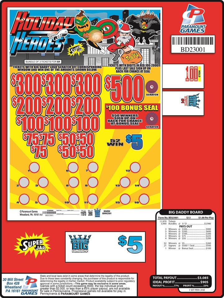 BIG DADDY BOARD TICKETS 11970 CT NLS (0) No Reviews yet Pinit $151.00 Quantity discounts available QuantityPrice Item name/number: PGBD23001 UPC: 393514 Denomination: 1.00Ticket Count: 11970Top Prize: $500.00Bottom Prize: $5.00Payout: $3,085.00Profit: $905.00Tip Style: Folded# of Pulls: 3Deals per Case: 1 Quantity -+ Add to Cart Reviews 0 BackRatings & ReviewsNo reviews availableBe the first to Write a Review