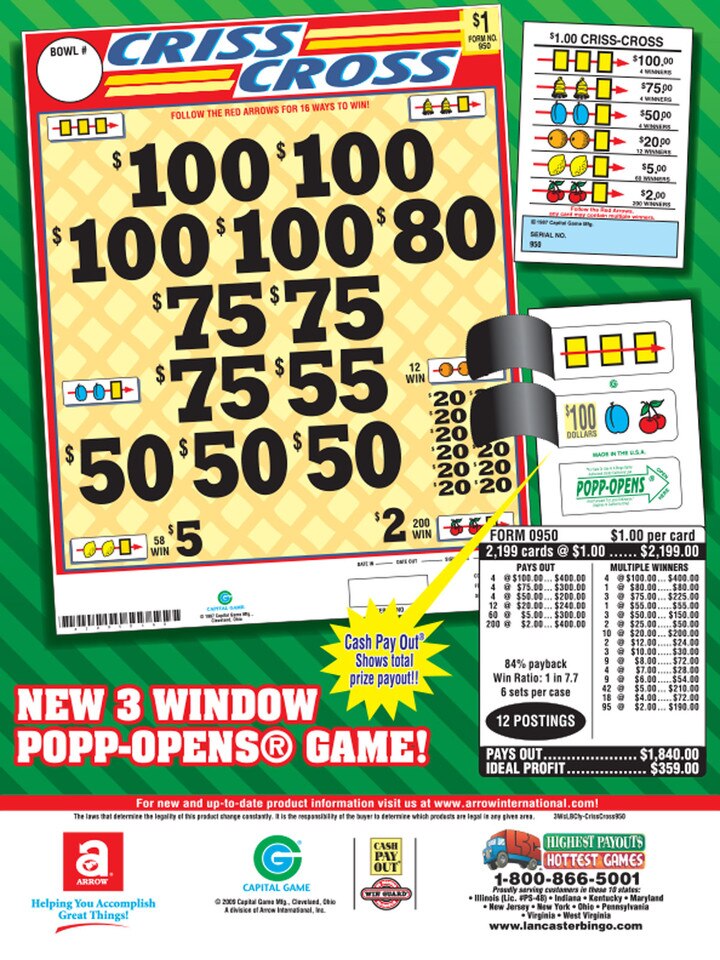 This Criss Cross game is a traditional 3 window game. With a top prize of $105 and 3 others also winning $100 it's just what a criss cross style player is expecting. And lot's of $2 playback on the bottom end. It's a great old game that players come back to time and time again. Make sure you're offering an oldie but a goodie to your players. They will love all the winners.