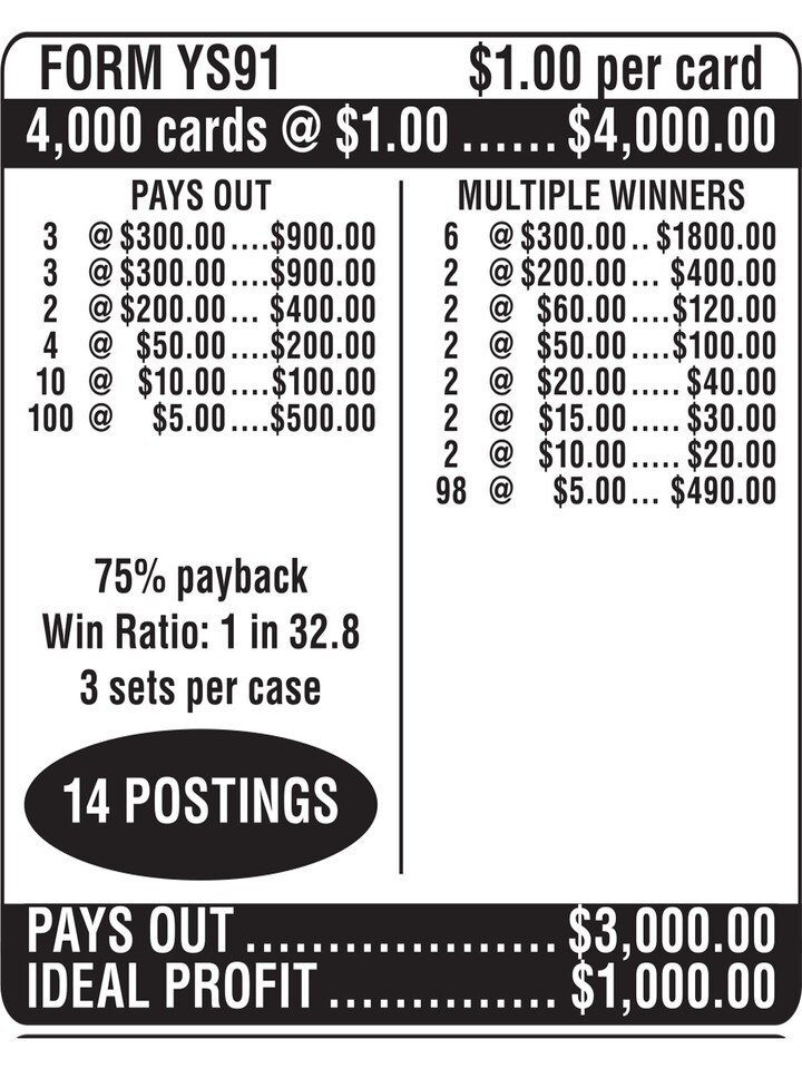 MISTLE DOUGH 4000 CT NLS (0) No Reviews yet Pinit $224.50 Quantity discounts available QuantityPrice Item name/number: AIYS91 UPC: 393936 Denomination: 1.00Ticket Count: 4000Top Prize: $300.00Bottom Prize: $5.00Payout: $3,000.00Profit: $1,000.00# of Pulls: 3Deals per Case: 3 Quantity -+ Add to Cart Reviews 0 BackRatings & ReviewsNo reviews availableBe the first to Write a Review