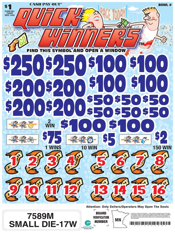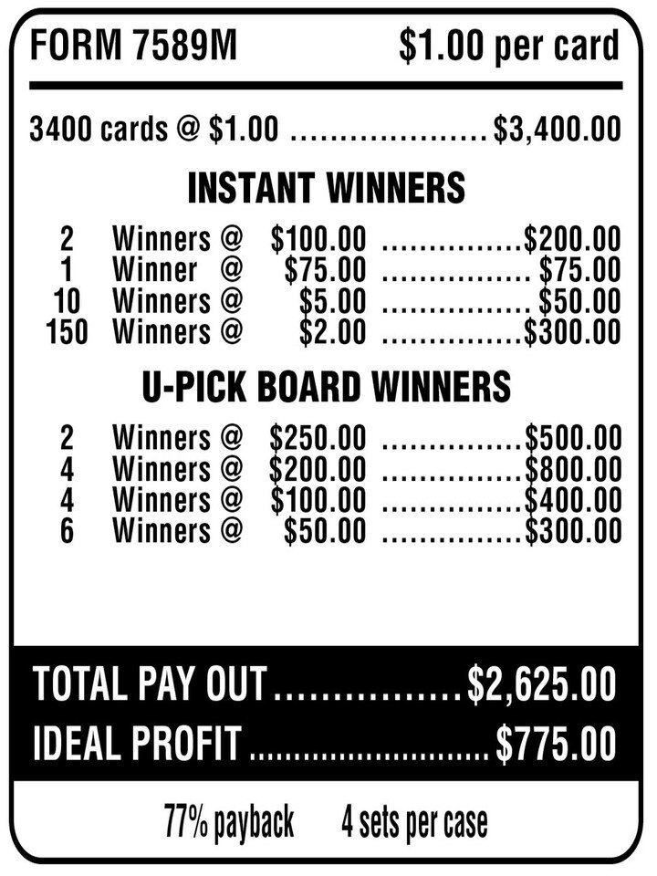 QUICK WINNERS 3400 CT NLS (0) No Reviews yet Pinit $169.00 Quantity discounts available QuantityPrice Item name/number: AI7589M UPC: 396345 Denomination: 1.00Ticket Count: 3400Top Prize: $250.00Bottom Prize: $75.00Payout: $2,625.00Profit: $775.00# of Pulls: 3Deals per Case: 4 Quantity -+ Add to Cart Reviews 0 BackRatings & ReviewsNo reviews availableBe the first to Write a Review
