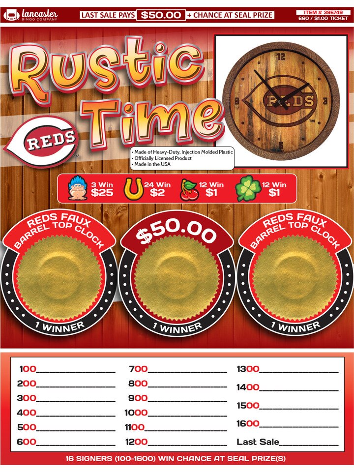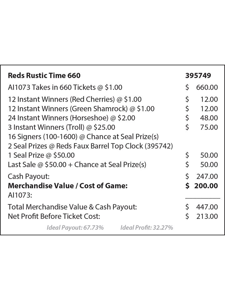 Reds Rustic Time 660 LSNLS SEA (0) No Reviews yet Pinit $200.00 Quantity discounts available QuantityPrice Item name/number: Reds Rustic Time 660 LSNLS SEA UPC: 395749 Special order product. Denomination: 1.00Ticket Count: 660Top Prize: $100.00Bottom Prize: $1.00Payout: $447.00Profit: $213.00# of Pulls: 5 Quantity -+ Add to Cart Reviews 0 BackRatings & ReviewsNo reviews availableBe the first to Write a Review